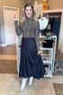 This stunning black satin swing skirt brings timeless elegance with a playful twist! The luxurious washed poly silk fabric and vintage-inspired pleats create movement and sophistication in one gorgeous piece.